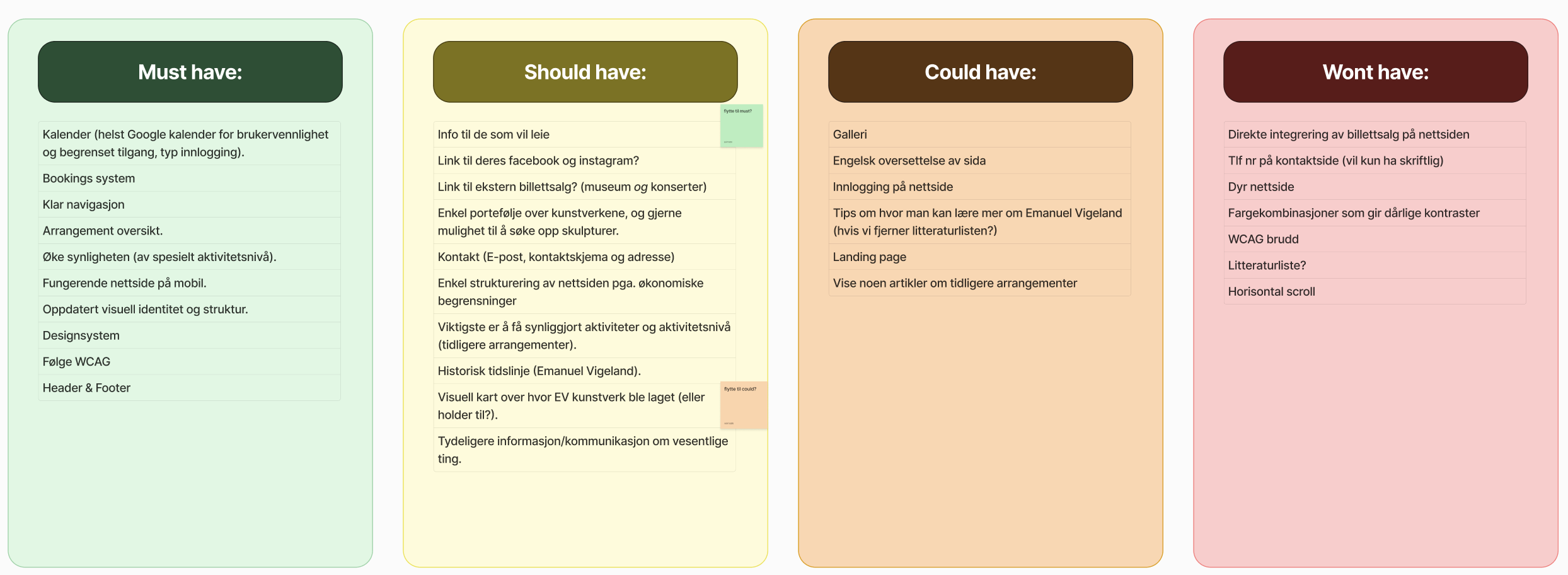 Dette prosjektet startet med en ekskursjon til Emanuel Vigelands museum. Emanuel Vigeland er broren til den kjente kunstneren Gustav Vigeland. Nettsiden er svært utdatert og svarer ikke til dagens behov. Det er blant annet vanskelig å bestille billetter, men også leie lokalet for arrangementer. Mye av kommunikasjonen går igjennom Facebook, og besøkende får ikke med seg alle arrangementene. Her gjorde vi oss noen notater og snakket med oppdragsgiveren for å få en bedre forståelse av behovet og brandingen.